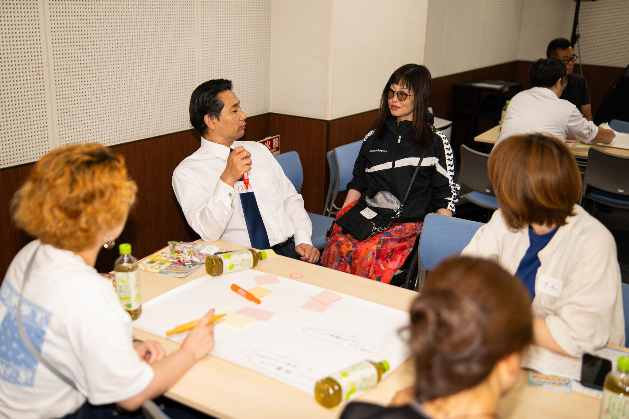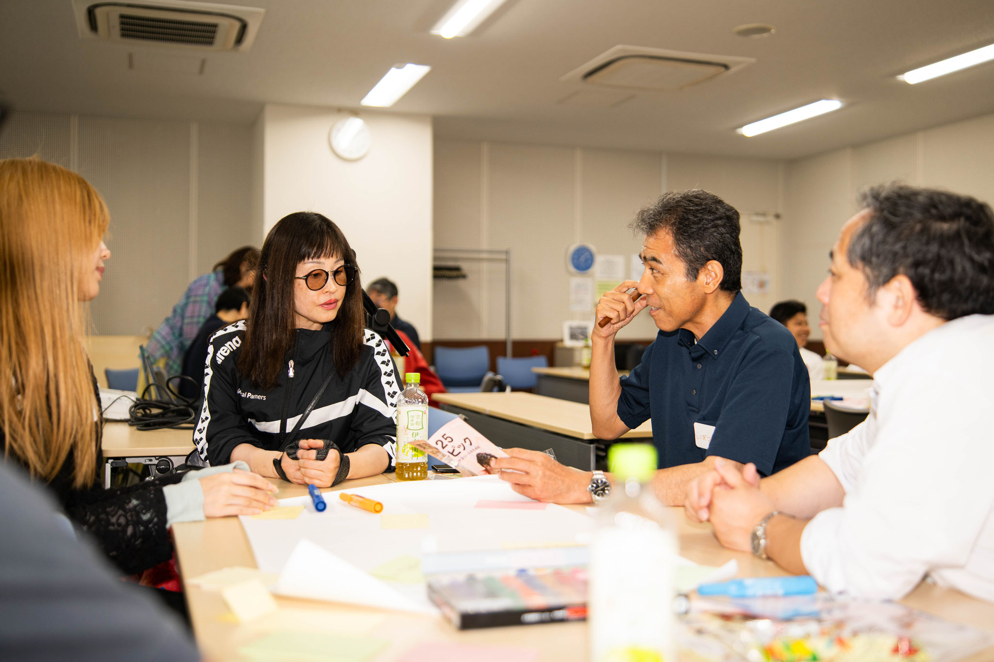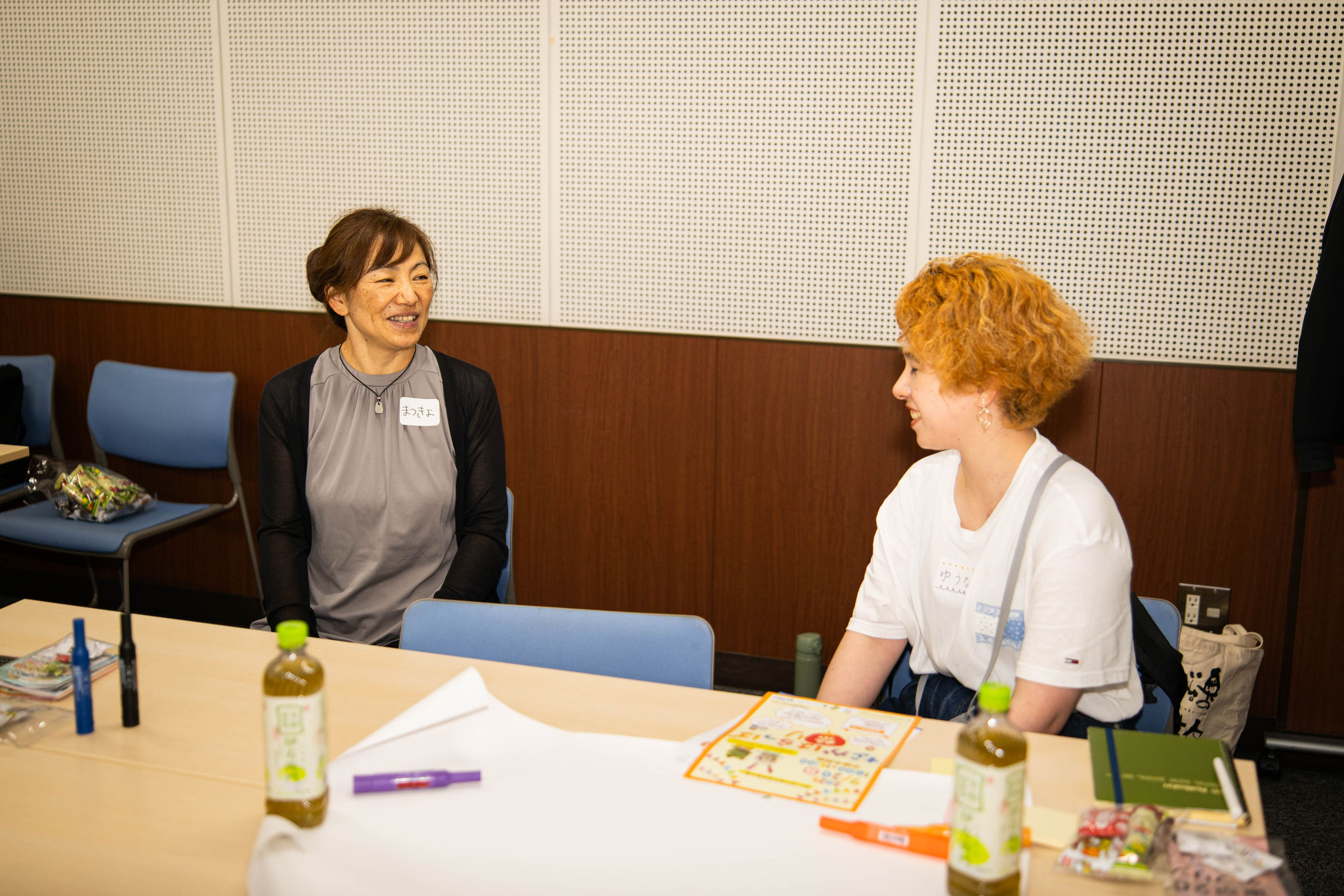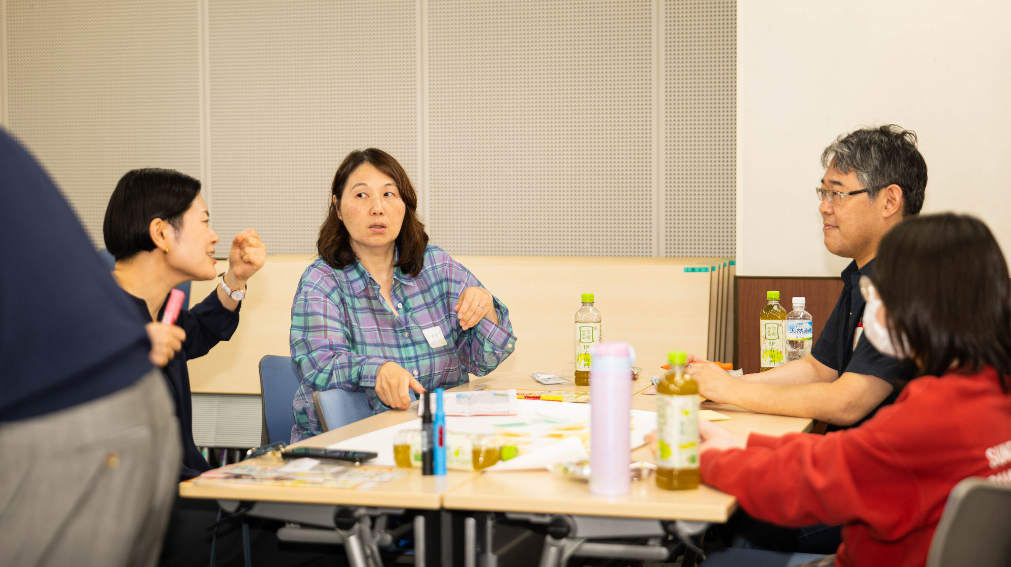 先生役 まろえもんさんたちの話題提供の後は、生徒役(参加者)のみなさんでダイアログ。問いは「デフリンピックで応援したいこと、応援できること」「日常でも共生するために私たちがすること」。